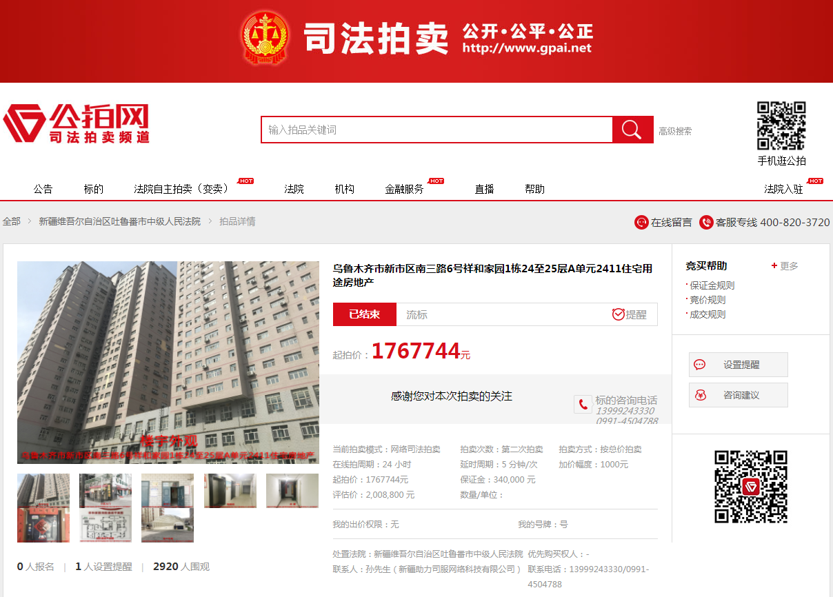 【二拍流拍】乌鲁木齐市新市区南三路6号祥和家园1栋24至25层A单元2411住宅用途房地产