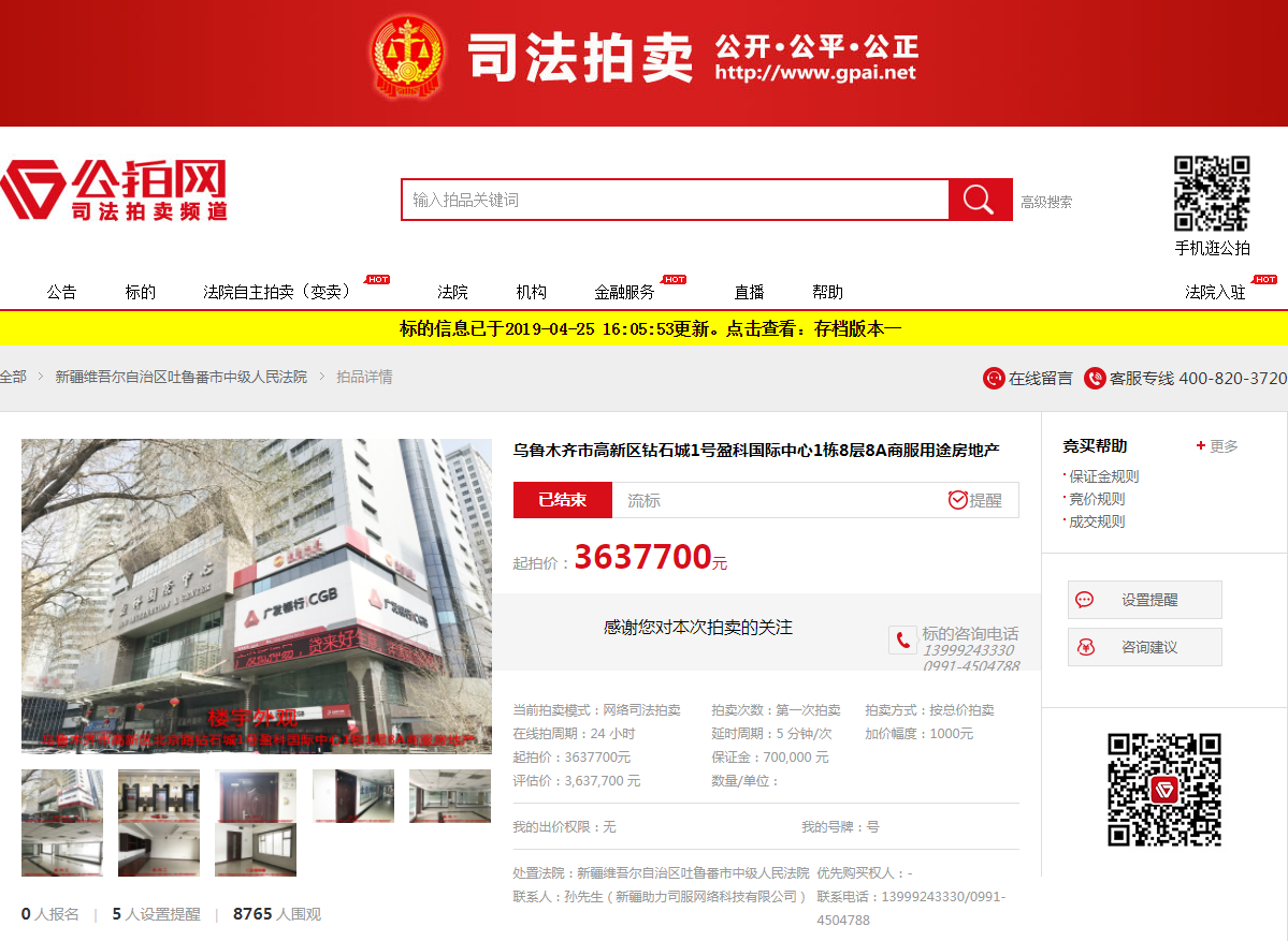 【一拍流拍】乌鲁木齐市高新区钻石城1号盈科国际中心1栋8层8A商服用途房地产