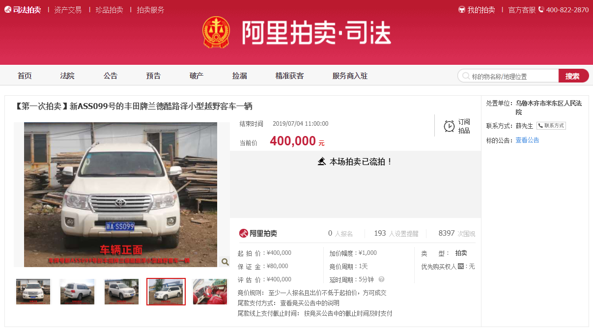 【一拍流拍】新ASS099号的丰田牌兰德酷路泽小型越野客车一辆