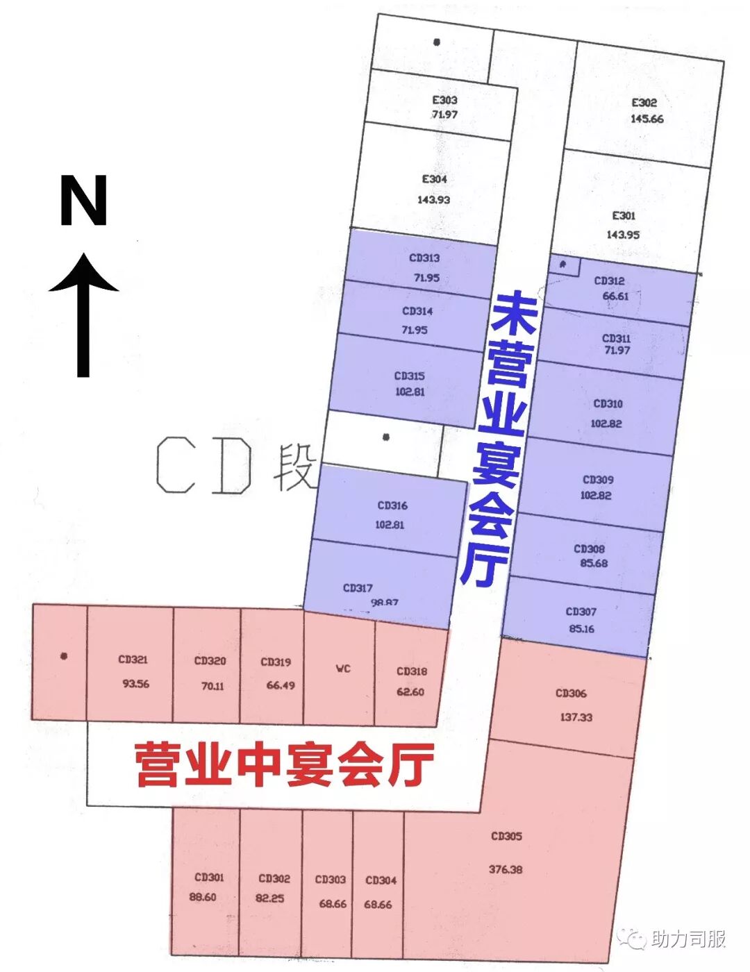 CD301~CD306及CD318~CD321整体宴会厅整体出租使用,目前正在营业中。