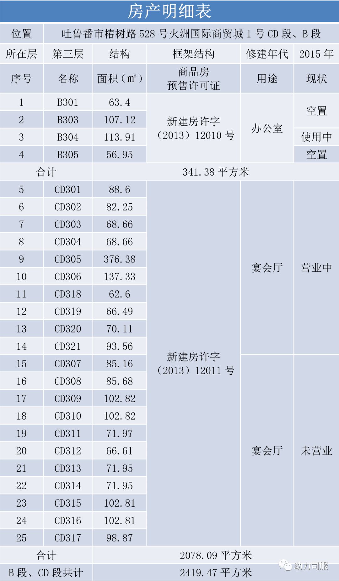 吐鲁番市椿树路528号吐鲁番火洲商贸城1号B段、CD段3层商铺及土地使用权